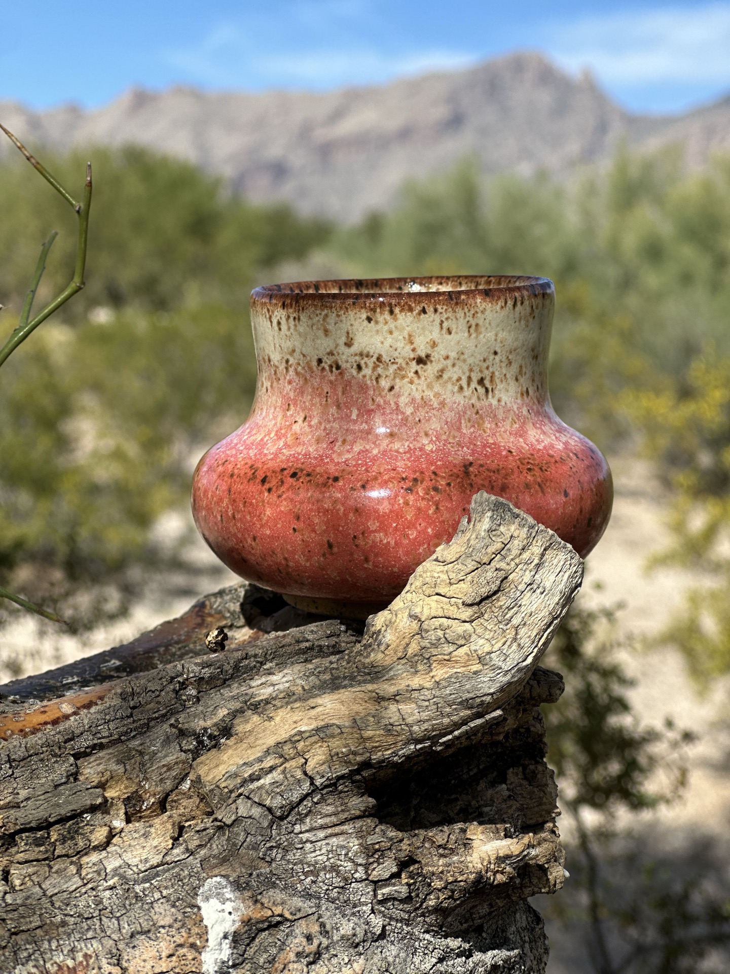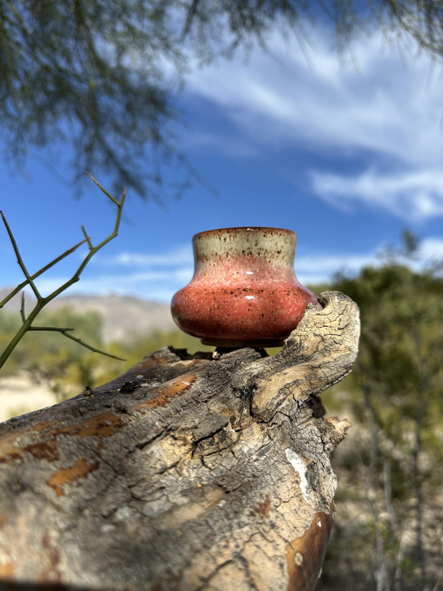 I wanted to try a red to white gradient with a little cup I made. I wanted to achive a pink color in the gradient, and while I know it’s possible, when mixing colors, I just wasn’t sure how it would turn out with glazes. I really liked how it turned out so I tested the same technique on a bowl that has a small crack on the bottom. I can only use it to hold dry stuff, but it really is just a test. We’ll see how it turns out.